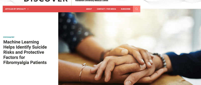 Discover released coverage of our study of suicide attempt risk (and an external validation predicting suicidal ideation) in a condition known to be associated with increased risk of suicide, fibromyalgia. Thanks for tackling our small study of a complex, and nuanced problem. Much more to be done to turn this predictive approach into prevention. …